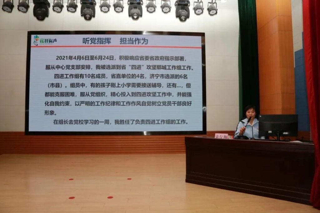 袁存梅同志以“四进攻坚”为主题讲授专题党课,围绕自己的“四进”工作展开讲解,重点介绍了其所在“四进”工作组“听党指挥、担当作为”、“自我锤炼、提升能力”和“团结协作、主动作为”等相关事迹。细致讲述了他们进企业、进项目、进乡村、进社区的典型案例与心得体会。她提到,尽管两个半月的“四进”时间并不算长,工作中也伴随着疲惫和汗水,但却有很多收获和成长。“四进”工作组的成员们始终以饱满的精神状态投身基层一线,努力抓好疫情防控、经济发展和民生保障等各项工作。
