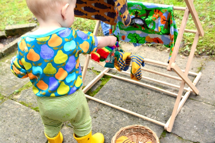 上图是小朋友在矮衣架上晾袜子。